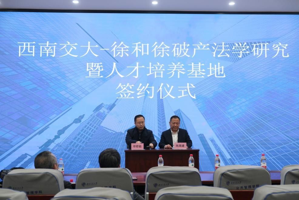 讲座开始前,举行了太阳集团2007与四川徐和徐清算事务有限公司共建“破产法学研究与人才培养基地”的《合作框架协议》签约仪式。太阳集团2007经理助理邓君韬老师与四川徐和徐清算事务有限公司总经理陈周建先生代表双方签约。主持人魏琼老师提出,伴随国内经济增长速度下行,办理破产案件的法律理论和实务成为法学研究的热点和法律执业人的重要业务。依托西南交大建设工程类学科和人才优势,研究房地产企业破产的专门法律问题,培养具备办理破产案件专门知识和能力的人才,成为交大法律人适应实践需要的重要任务。双方共建“西南交大-徐和徐破产法学研究与人才培养基地”,旨在推动破产管理“产、学、研”的一体化融合,既为依托高校科研、人才优势促进破产法研究并解决破产管理实务问题提供桥梁,也为培养各位法员工成为破产法专业领域的研究和实务人才奠定基础。